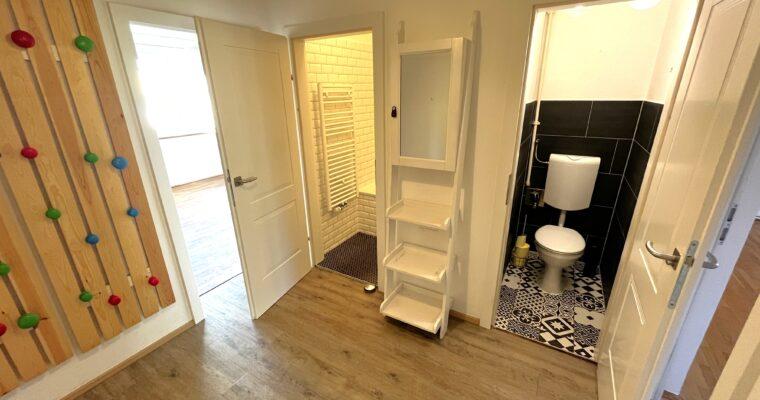 Raumaufteilung: Vorraum (6,9 m²), Badezimmer mit Badewanne, WC getrennt, zwei Schlafzimmer (16 m²/ 9,6 m²), Wohnzimmer ( 21,5 m²), Küche (3,46 m²), Vorratsraum (1,35 m²).