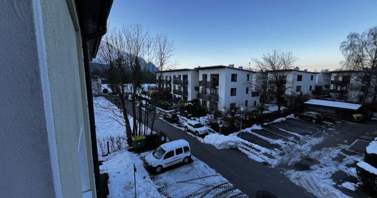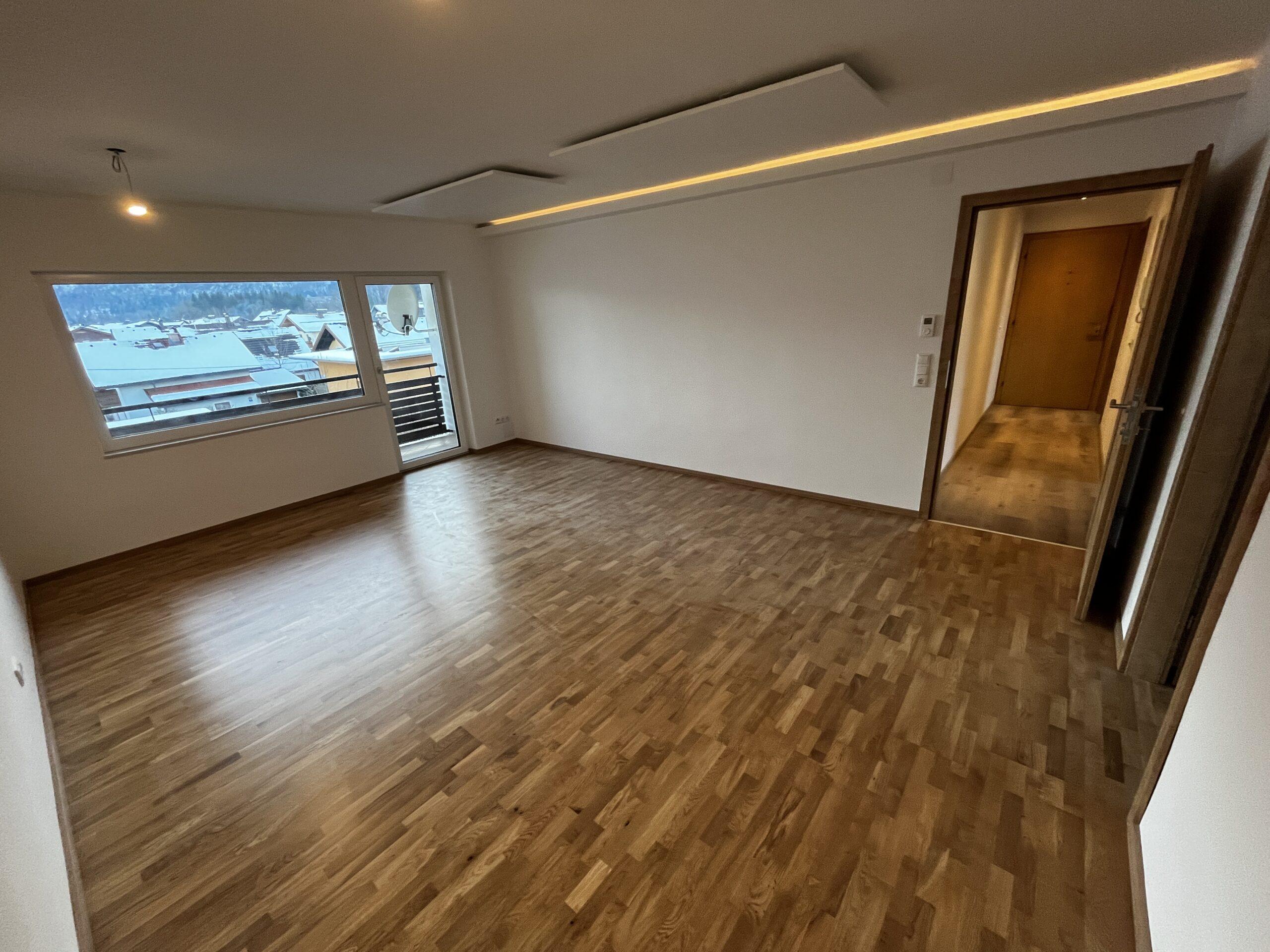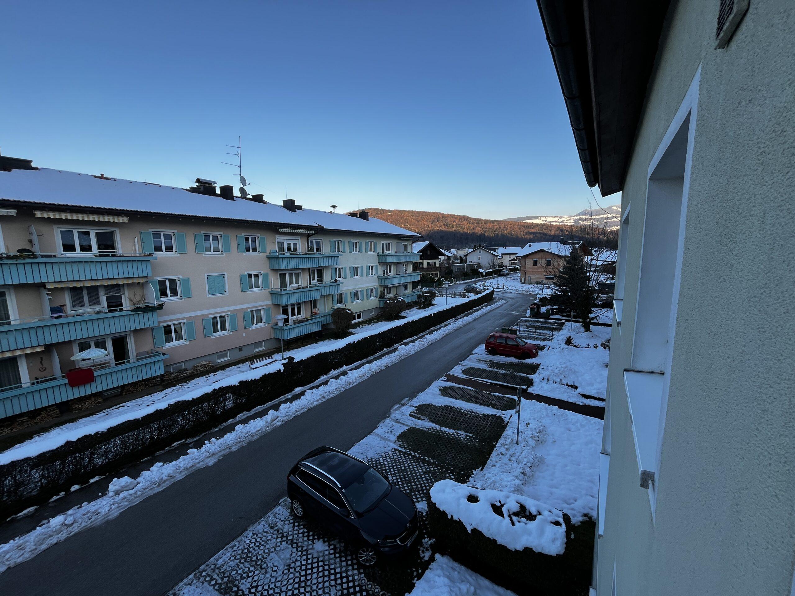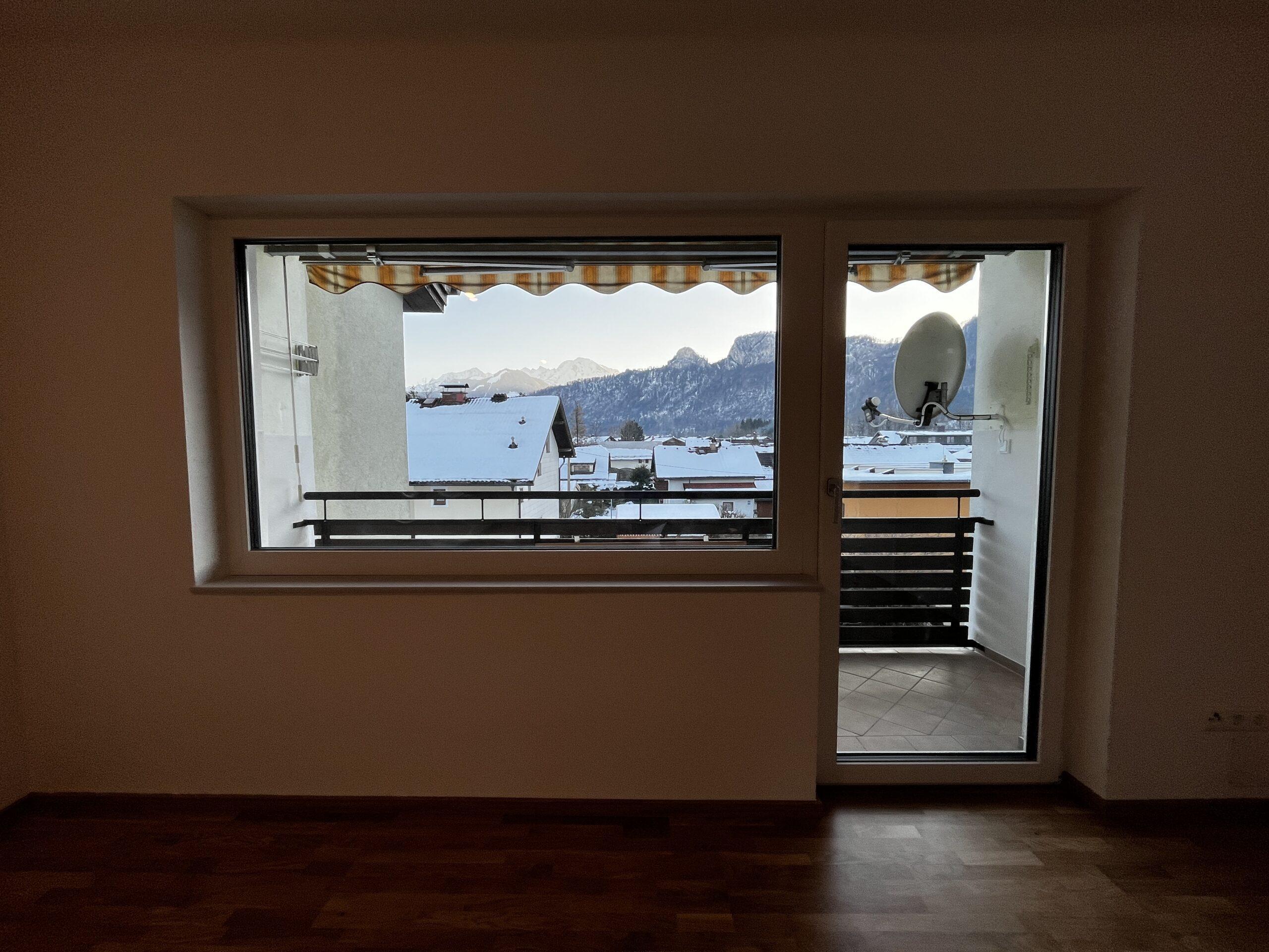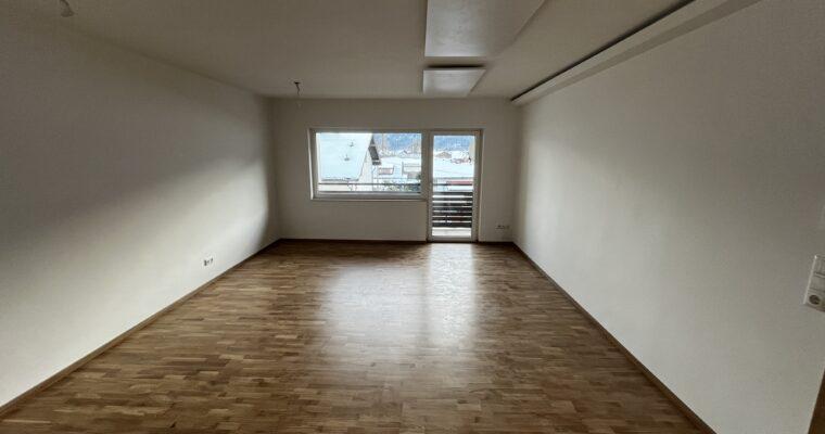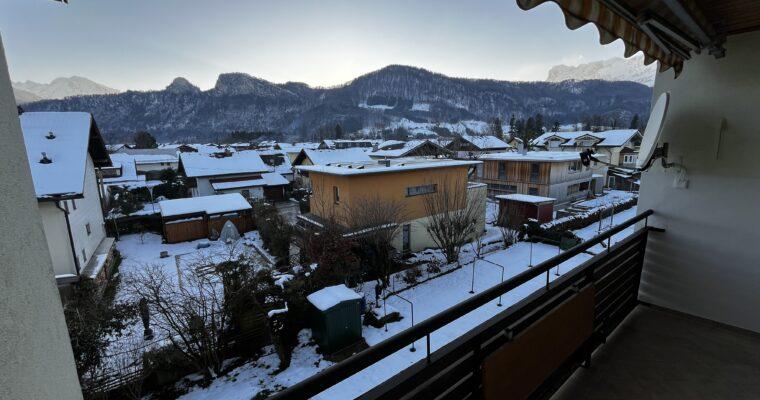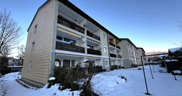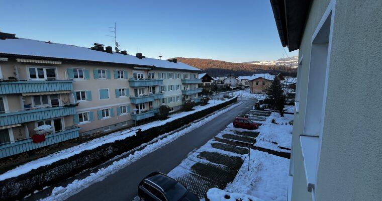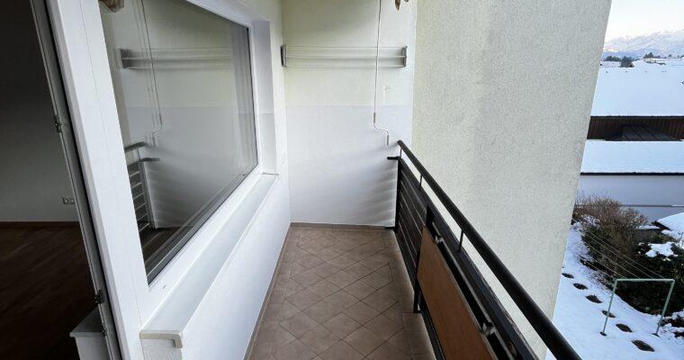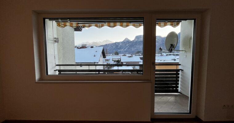 Aufteilung/Ausstattung: Großes Wohnzimmer (ca. 24 m²) mit Zugang zur sonnigen Loggia in Süd – Ausrichtung mit Blick auf den Götschen/Barmstein, Schlafzimmer, Küche, Vorratszimmer, Badezimmer/WC mit Waschmaschinenanschluss und Fenster, Vorzimmer/Flur.