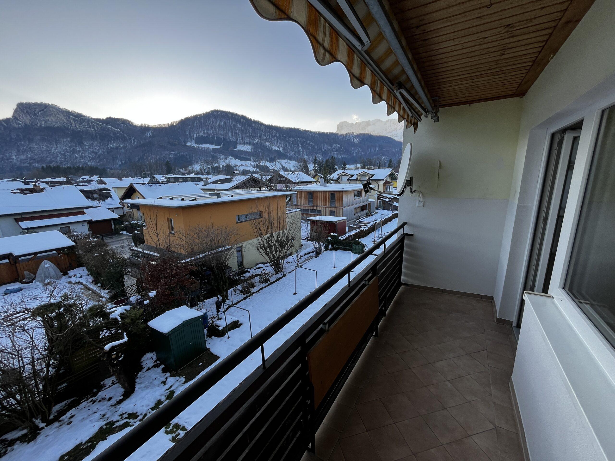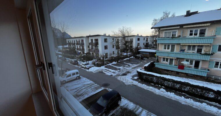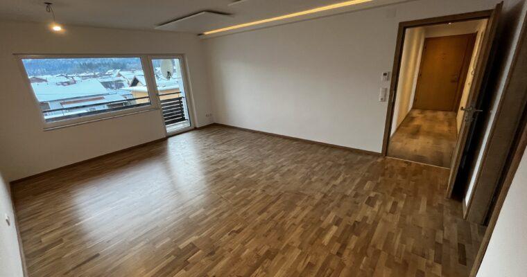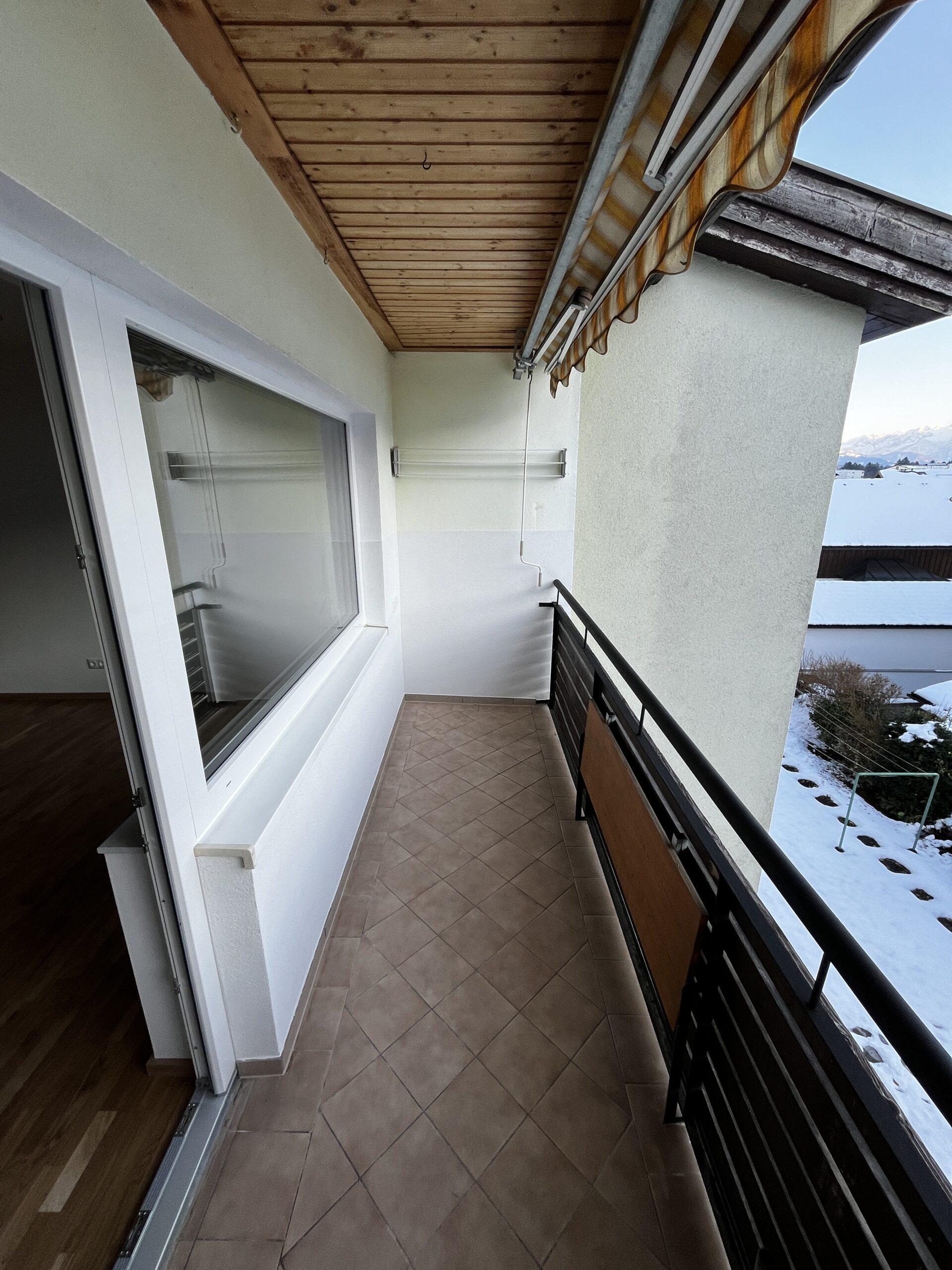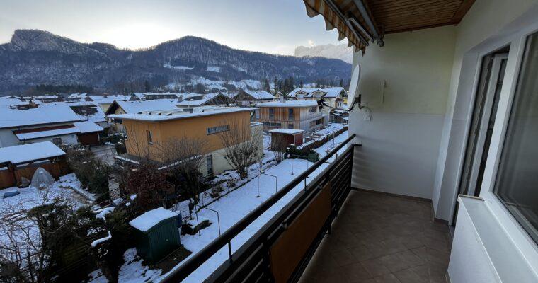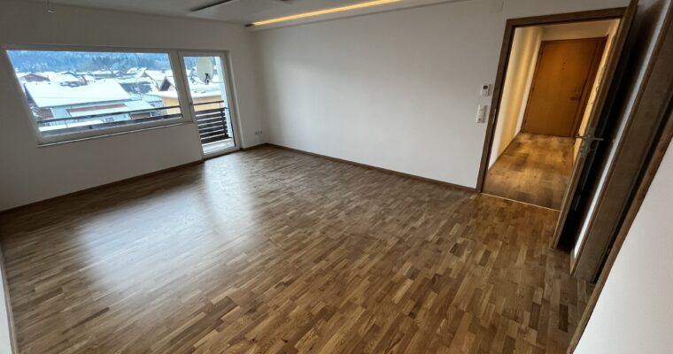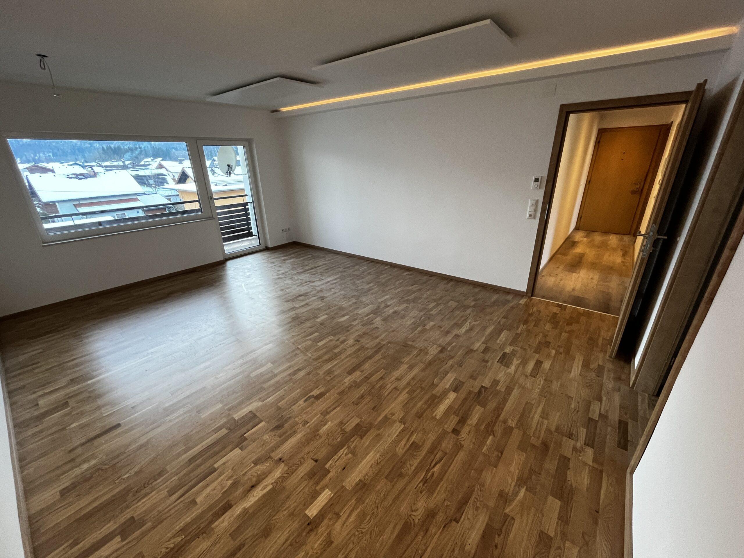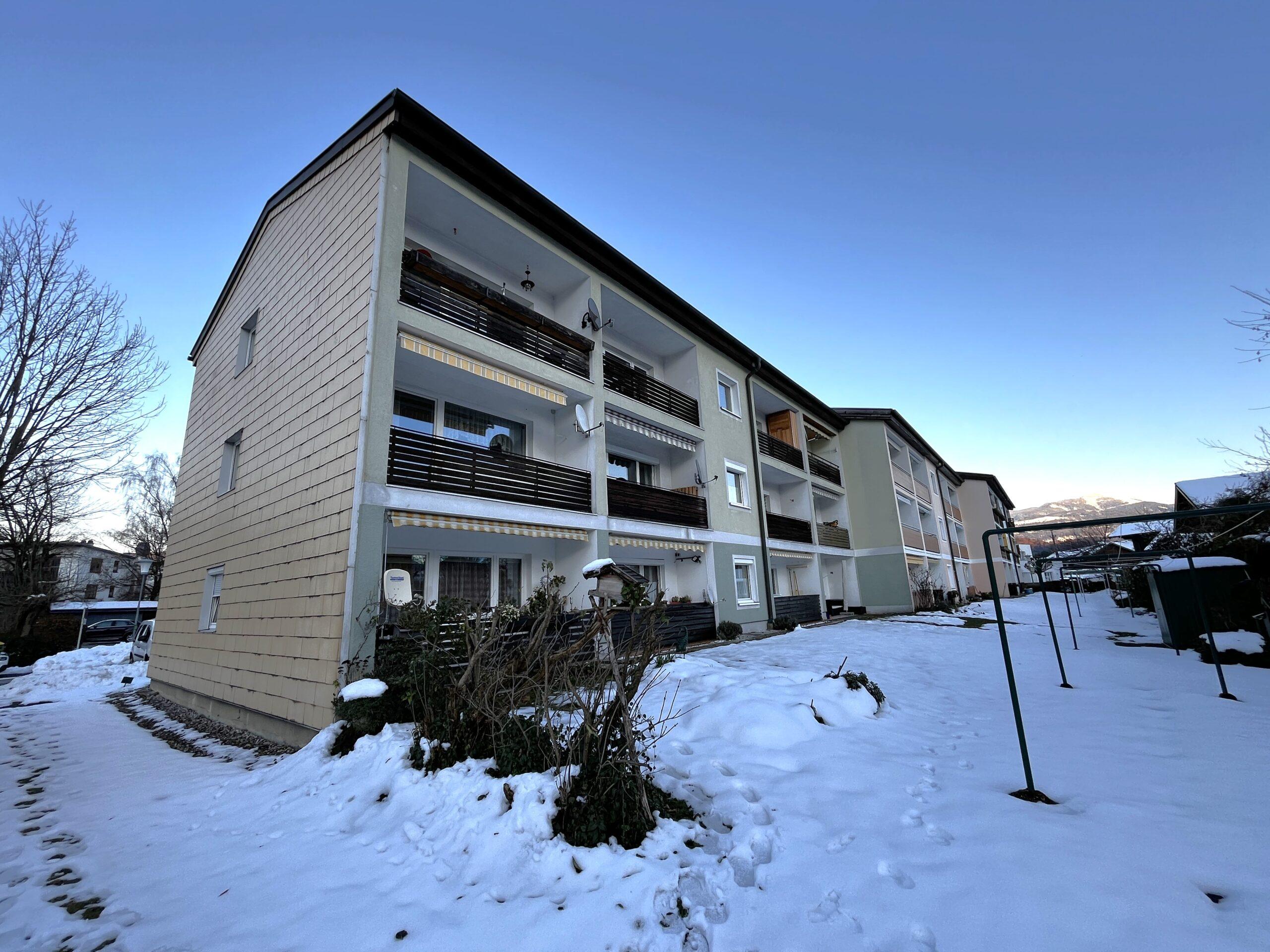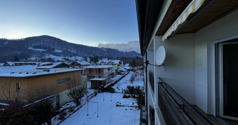Aufteilung/Ausstattung: Großes Wohnzimmer (ca. 24 m²) mit Zugang zur sonnigen Loggia in Süd – Ausrichtung mit Blick auf den Götschen/Barmstein, Schlafzimmer, Küche, Vorratszimmer, Badezimmer/WC mit Waschmaschinenanschluss und Fenster, Vorzimmer/Flur.