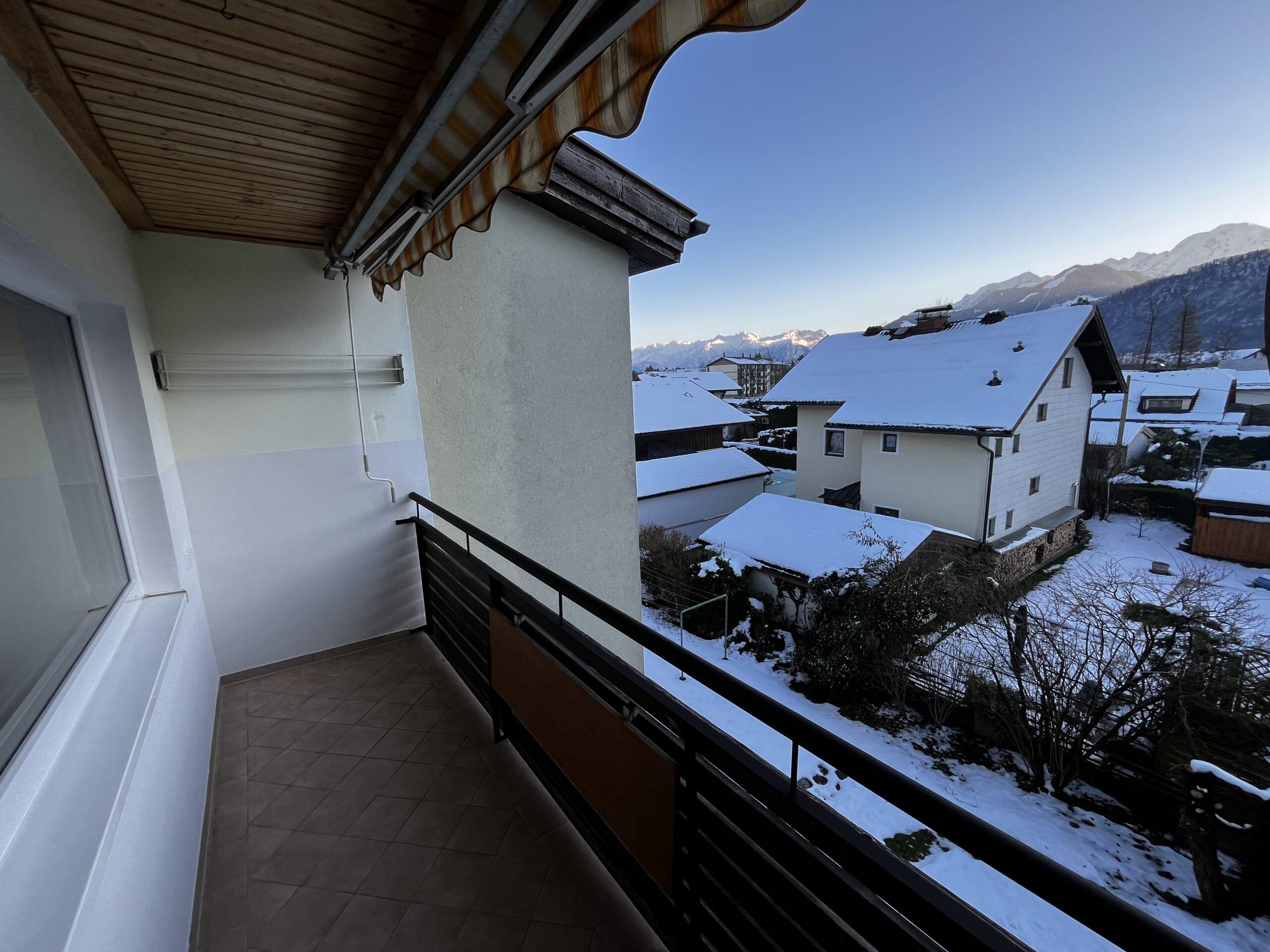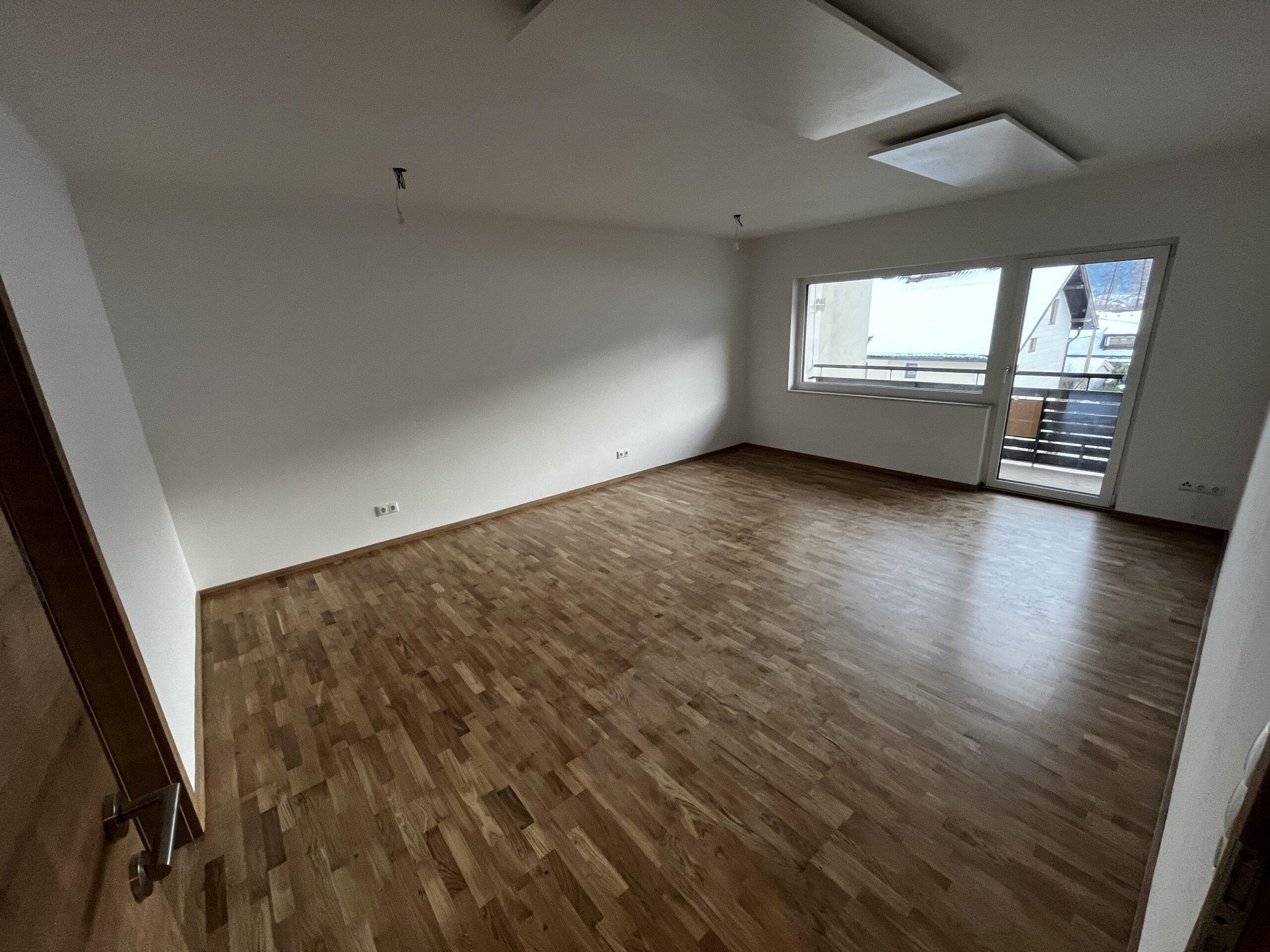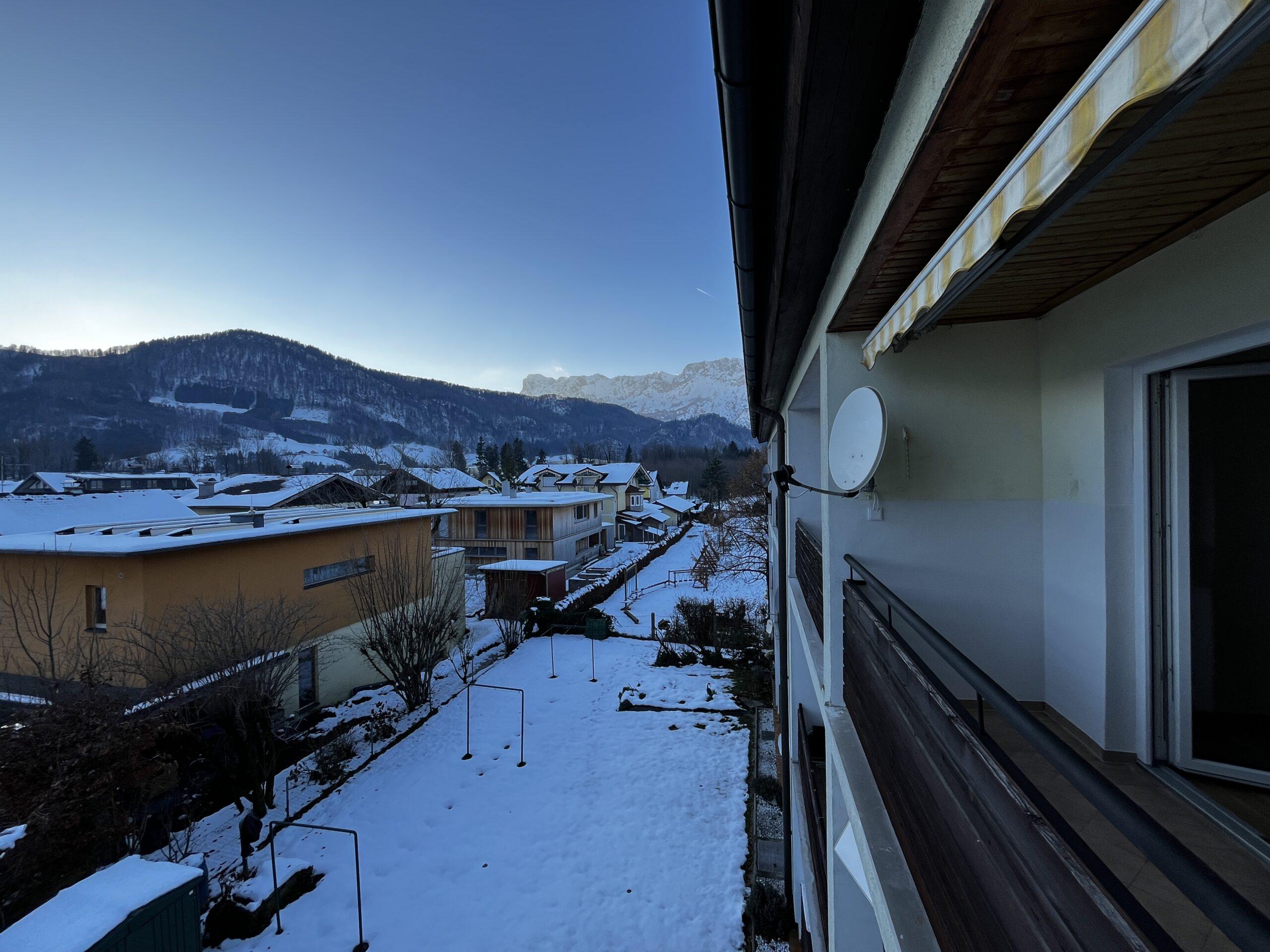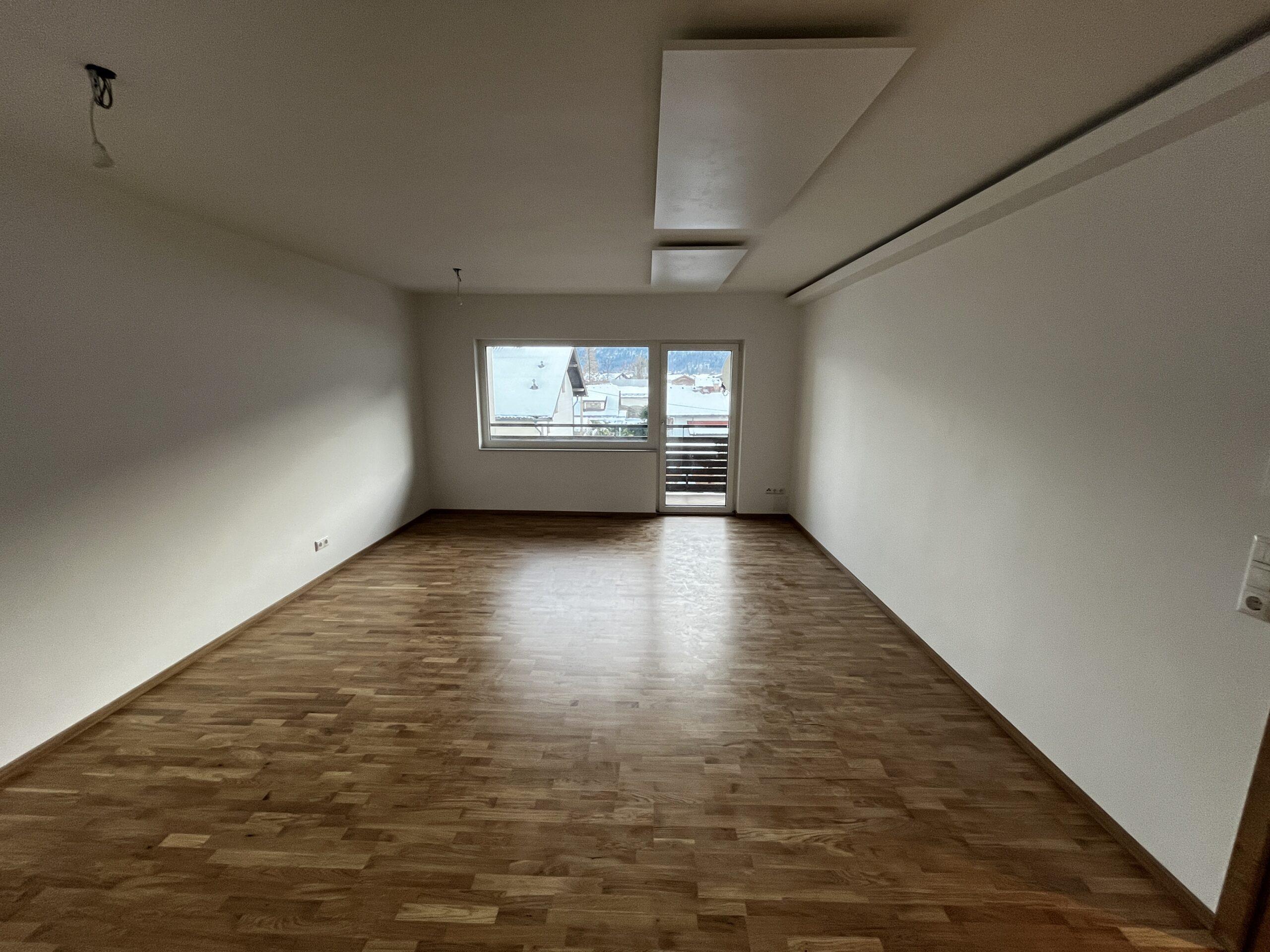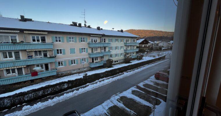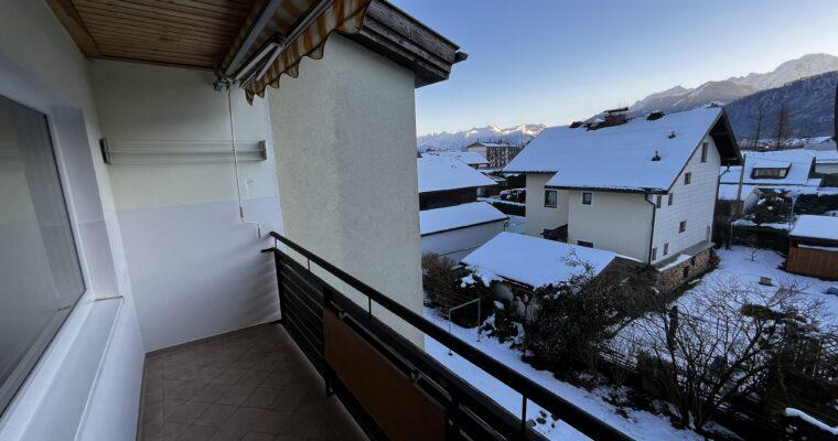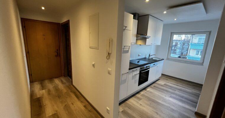 Aufteilung/Ausstattung: Großes Wohnzimmer (ca. 24 m²) mit Zugang zur sonnigen Loggia in Süd – Ausrichtung mit Blick auf den Götschen/Barmstein, Schlafzimmer, Küche, Vorratszimmer, Badezimmer/WC mit Waschmaschinenanschluss und Fenster, Vorzimmer/Flur.