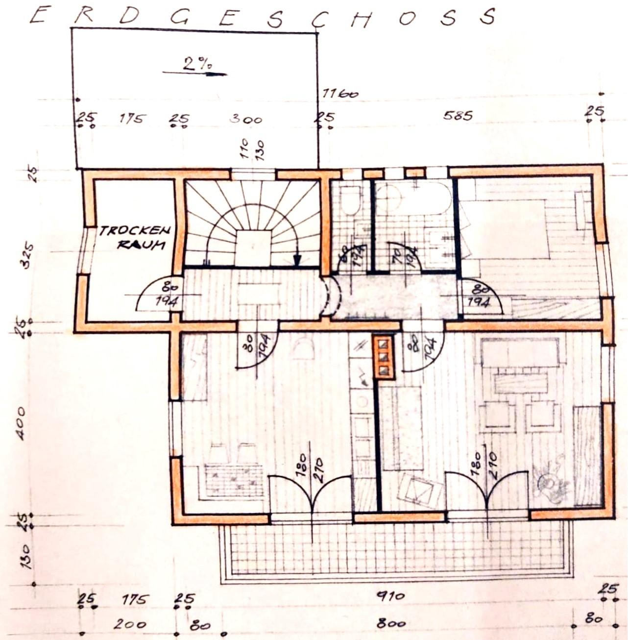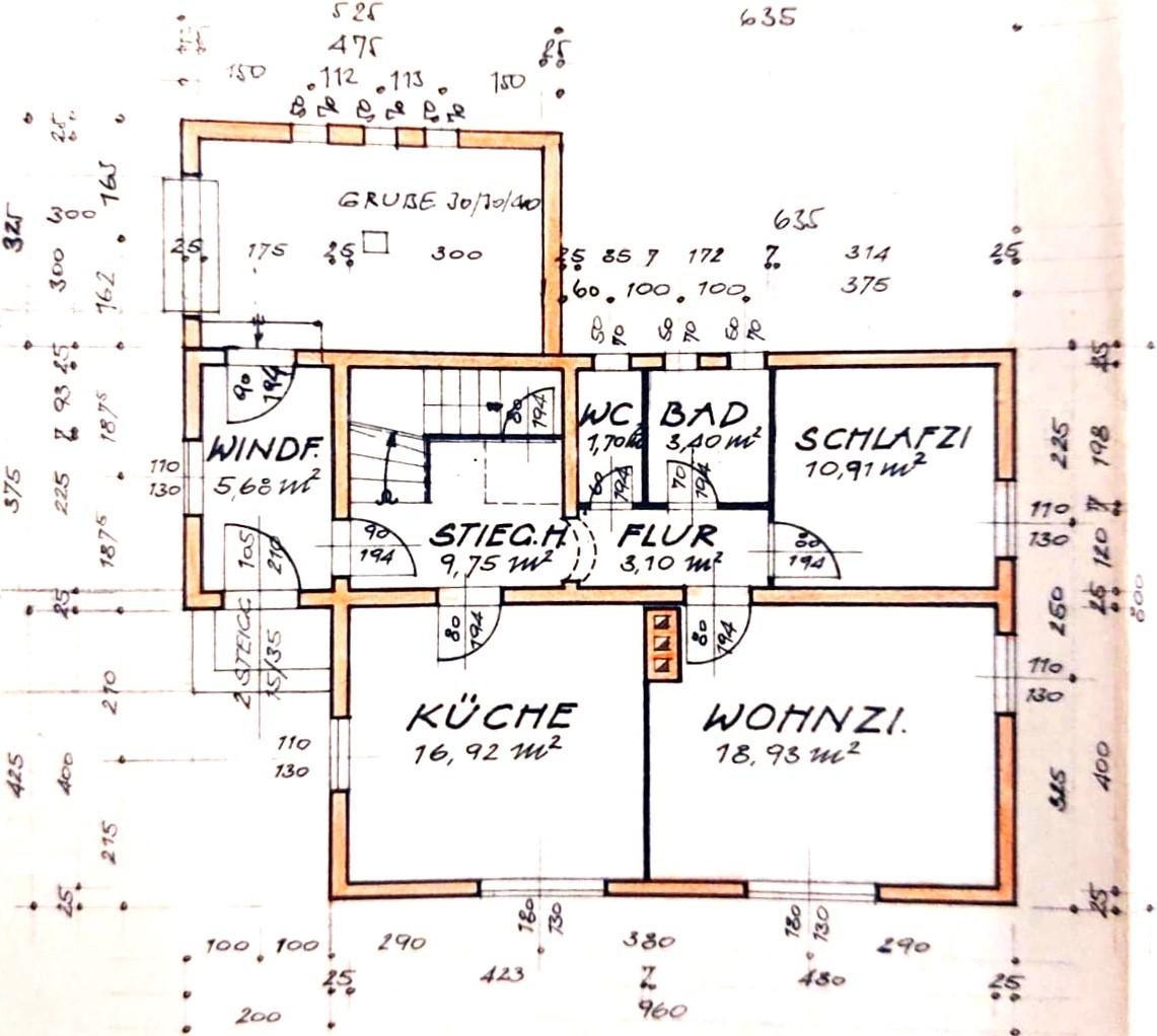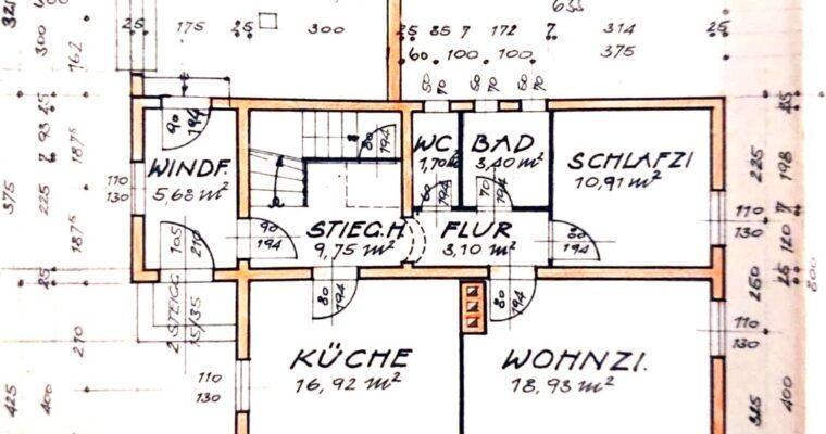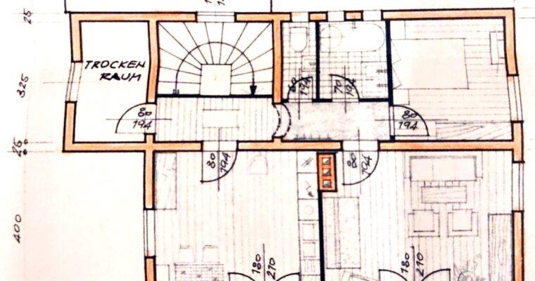 Erdgeschoß: Gesamt ca. 65 m², Vorraum, Wohn-Esszimmer mit Küche (ca. 17 m²), Wohn/Schlafzimmer (ca. 19 m²), weiteres teilweise möbliertes Schlafzimmer (ca. 11 m²), extra WC mit neuem Fenster, Badezimmer mit Badewanne und neuem Fenster, Stiegenhaus/Flur mit Abstellflächen